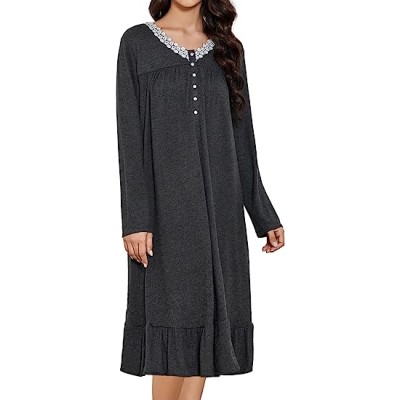 Long Sleeve Nightgowns for Women Soft Cotton Womens Gowns V Neck lightweight Sleepwear Lace Night Gown for Ladies