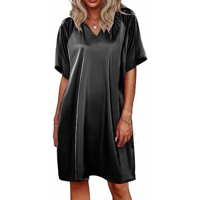 Women's Satin Nightgown Short Sleeve Silk Sleepwear V Neck Sleep Shirt Boyfriend Loose Nightshirt