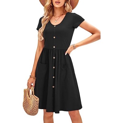 Women Short Sleeve Casual Dresses V Neck Knee Length Beach Dress with Pockets