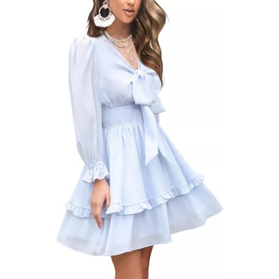 Women Tie Front Elastic Waist Tiered Ruffle Layer Floral Balloon Long Sleeve V-Neck A-Line Mini Dress