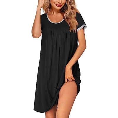 Women Nightgown Short Sleeve Comfy Sleepshirts Pleated Scoopneck Nightshirt
