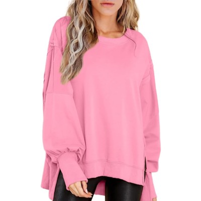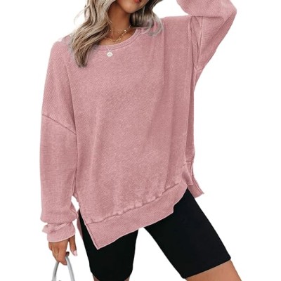 Womens Oversized Waffle Knit Crewneck Sweatshirts Long Sleeve Side Slits Casual Pullover Sweatshirt Tops