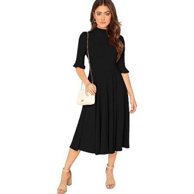 Women's Elegant Ribbed Knit Bell Sleeve Fit and Flare Midi Dress