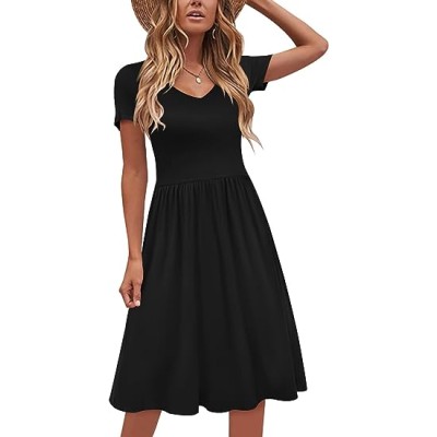 Women Short Sleeve Casual Dresses V Neck Knee Length Beach Dress with Pockets