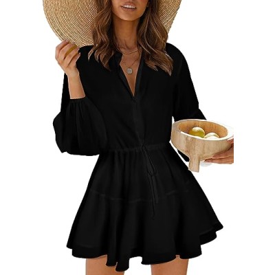 Womens Fall Summer Ruffle Lantern Sleeve Button Down Tie Waist Floral Print Swing Mini Dress
